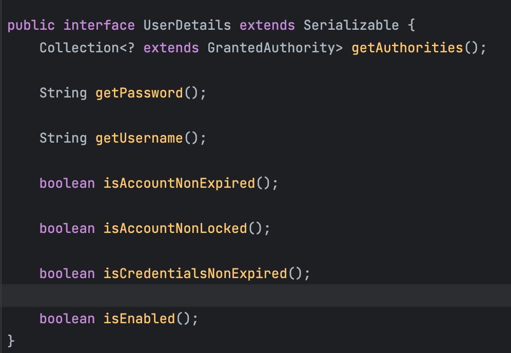 다음과 같이 UserDetails 를 정의를 하고 이제 인터페이스를 구현해봅시다.