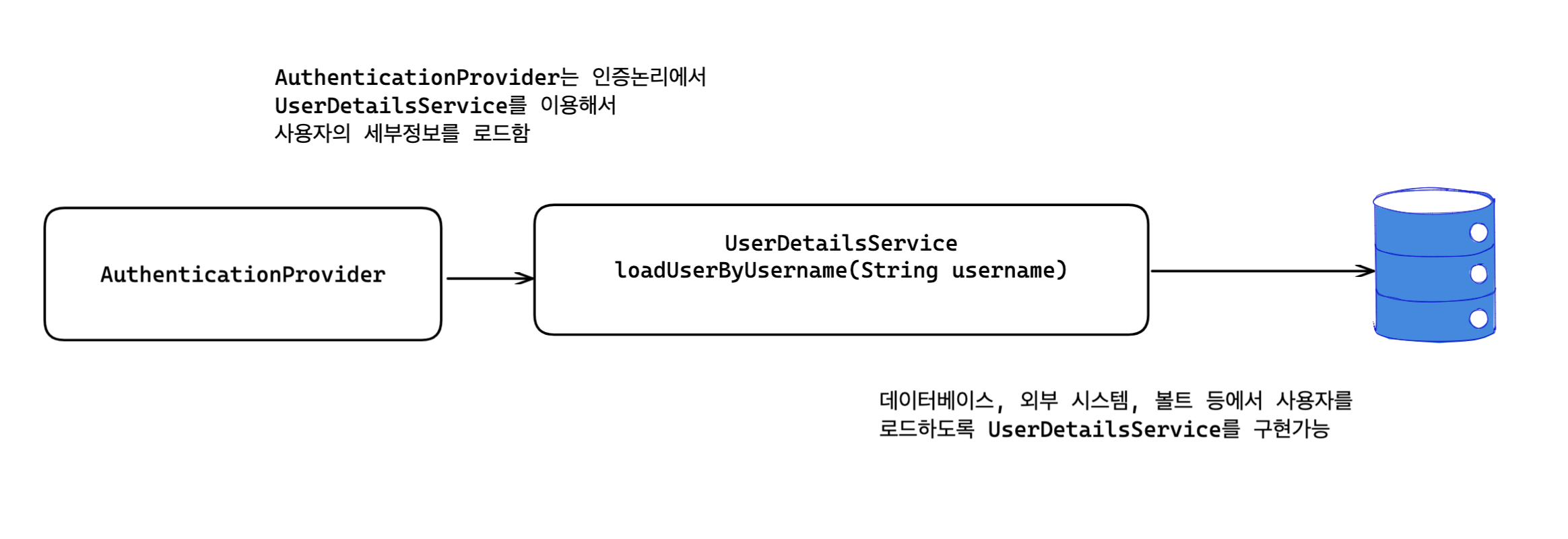 인증구현은 loadUserByUsername 메서드를 호출해서 주어진 사용자 이름을 가진 사용자의 세부정보를 얻을 수 있다.